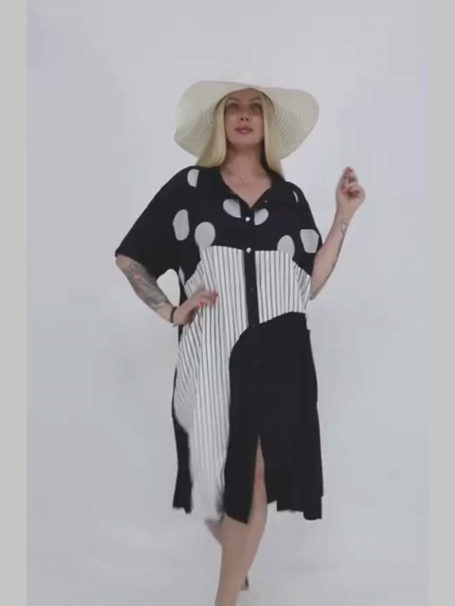 Tailored with care for fuller figures, the Chic Polka Dot and Stripe Button-Up Dress is available in sizes XL to 4XL. The design contours perfectly to plus-size body shapes, ensuring a comfortable and flattering fit.